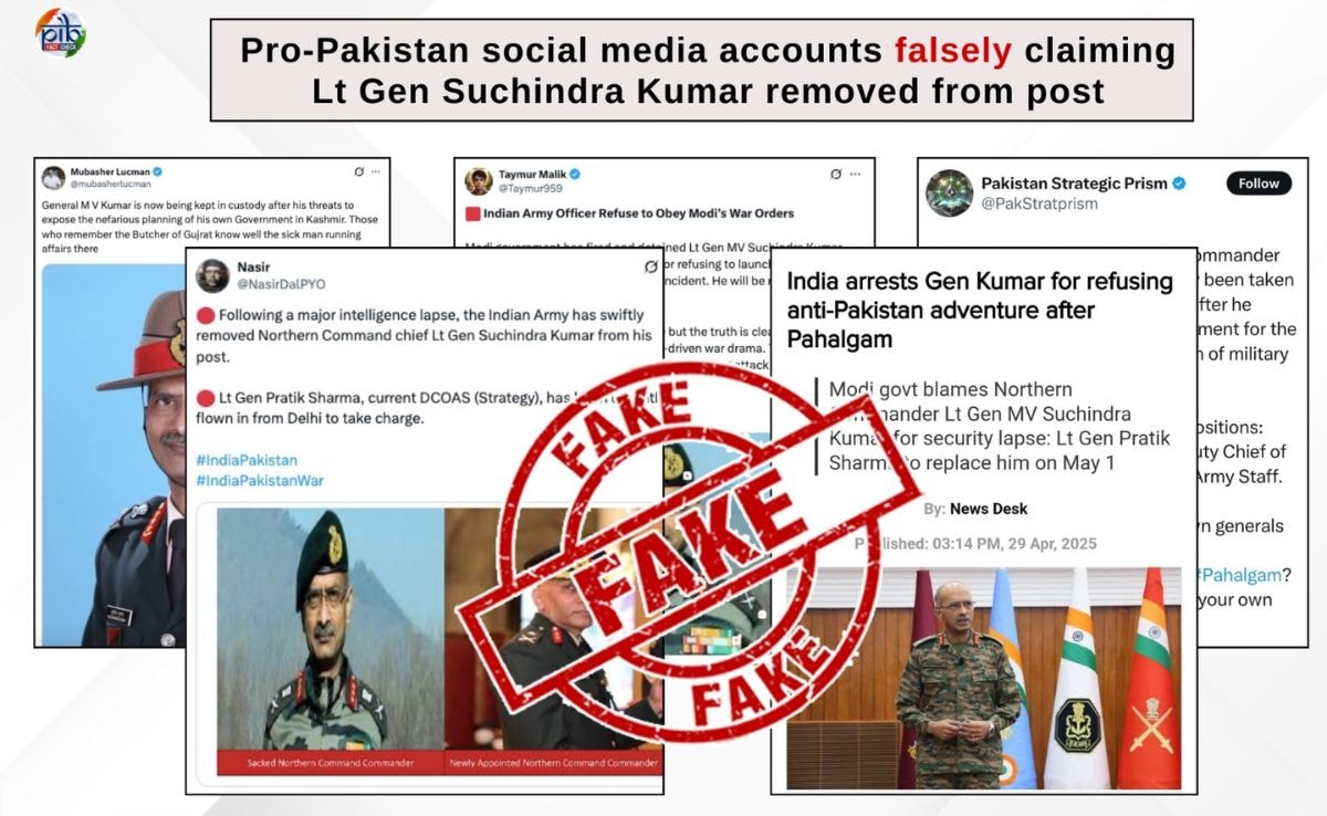 “అనేక పాకిస్తాన్ అనుకూల సోషల్ మీడియా ఖాతాలు పహల్గామ్ సంఘటన తరువాత నార్తర్న్ కమాండర్ లెఫ్టినెంట్ జెన్ సుచైంద్ర కుమార్ తన పదవి నుండి తొలగించబడ్డారని తప్పుగా పేర్కొన్నారు. ఈ పోస్టులలో చేస్తున్న వాదనలు నకిలీవి” అని ప్రభుత్వం తెలిపింది.