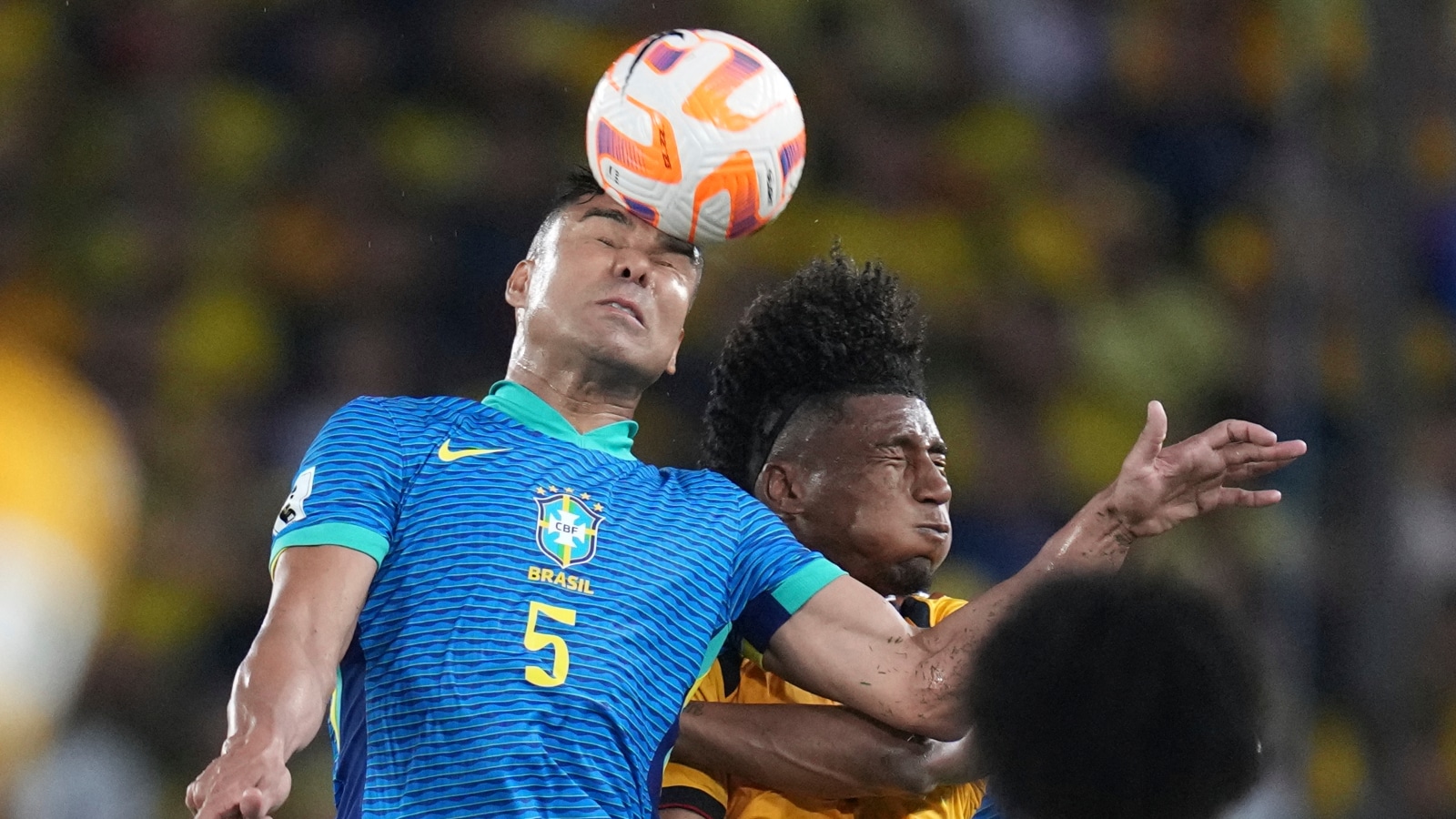 బ్రెజిల్ యొక్క కాసేమిరో (ఎడమ) మరియు ఈక్వెడార్ యొక్క కెవిన్ రోడ్రిగెజ్ ఒక శీర్షిక కోసం దూకుతారు. (AP ఫోటో)