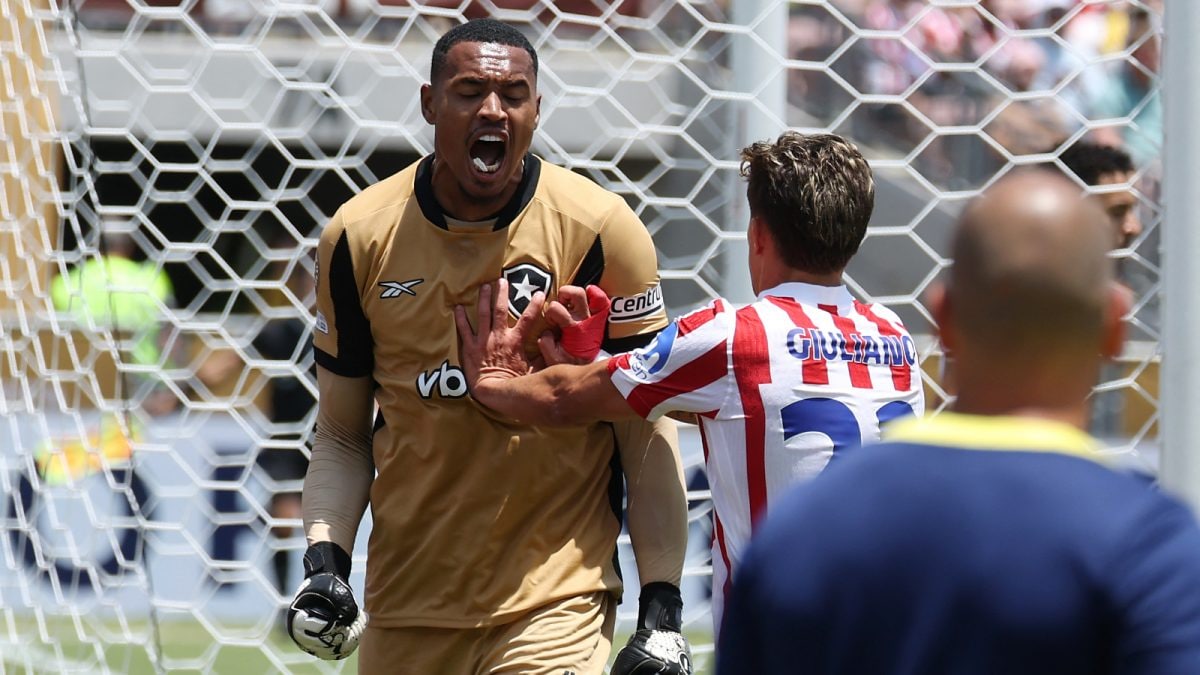 అట్లెటికో మాడ్రిడ్ యొక్క అర్జెంటీనా ఫార్వర్డ్ #22 గియులియానో సిమియోన్ బోటాఫోగో యొక్క బ్రెజిలియన్ గోల్ కీపర్ #12 జాన్ (AFP) తో వాదించాడు