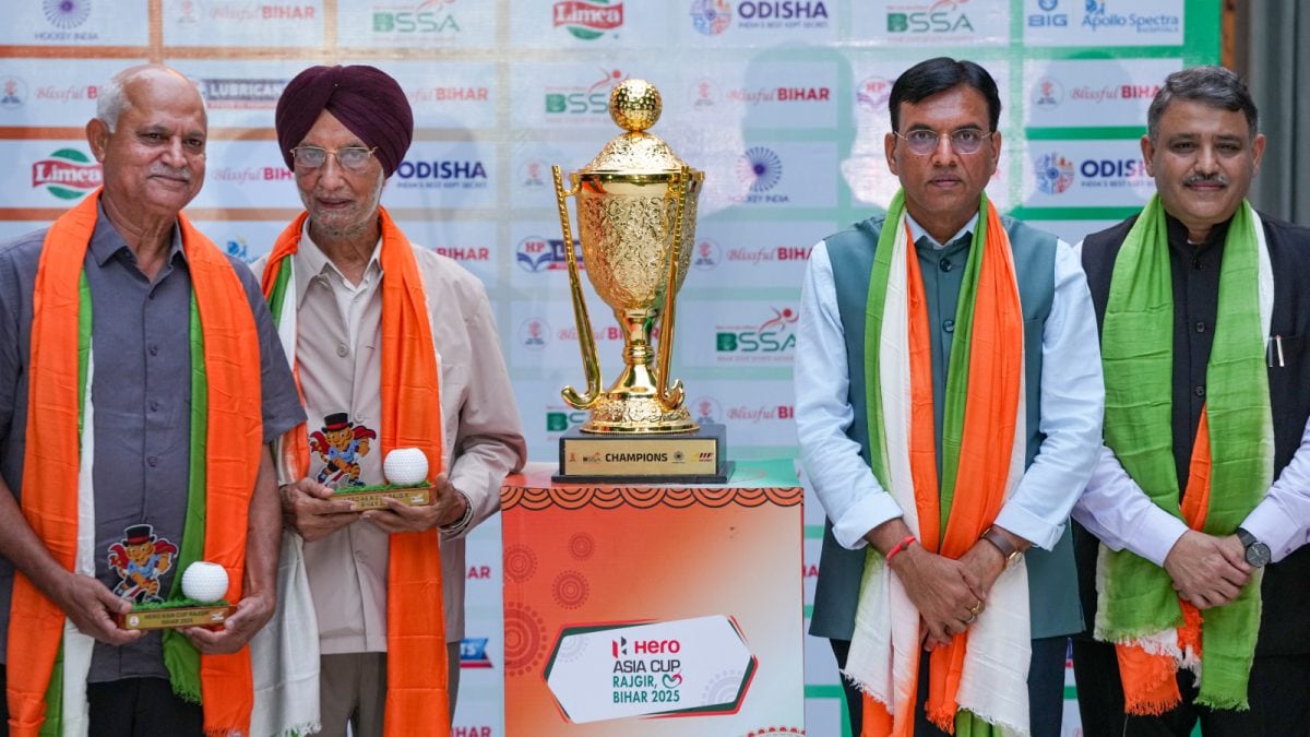 ఆసియా కప్ 2025 ట్రోఫీని ఆవిష్కరించిన సందర్భంగా యూనియన్ స్పోర్ట్స్ మంత్రి మన్సుఖ్ మాండవియా మాజీ హాకీ ఆటగాళ్ళు జాఫర్ ఇక్బాల్,) (ఎడమ), హర్బిందర్ సింగ్ (2 వ ఎడమ). (పిటిఐ ఫోటో)