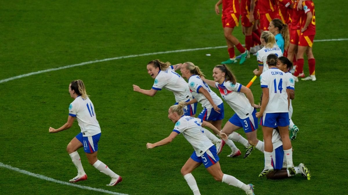 స్పెయిన్తో జరిగిన మహిళల యూరో 2025 ఫైనల్లో గెలిచిన ఇంగ్లాండ్ ఆటగాళ్లు సంబరాలు చేసుకున్నారు (చిత్రం క్రెడిట్: AP)